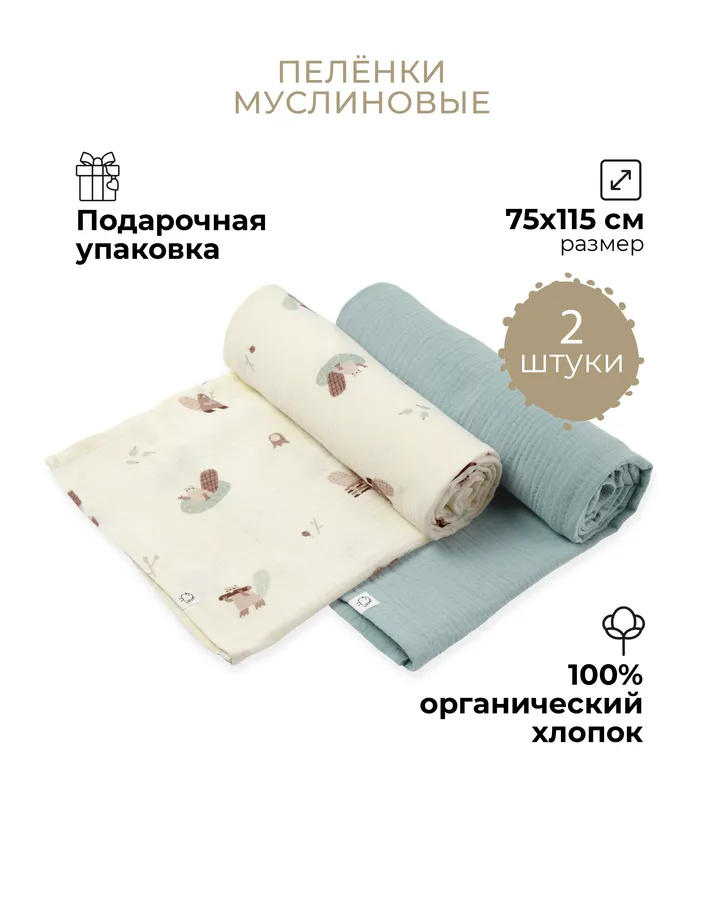 Пелёнка BUBA KIDS Бобры на хуторе/Полынь муслин 75х115 см 2 шт.