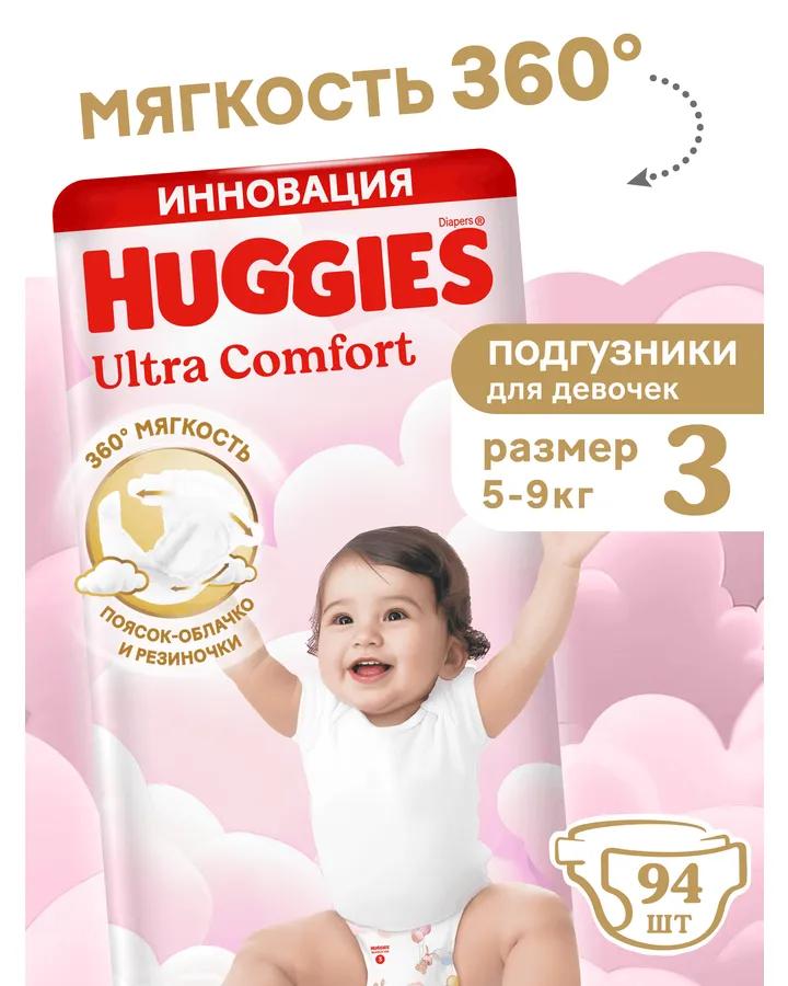 Подгузники Huggies Ultra Comfort для девочек 3 (5-9 кг) 94 шт.