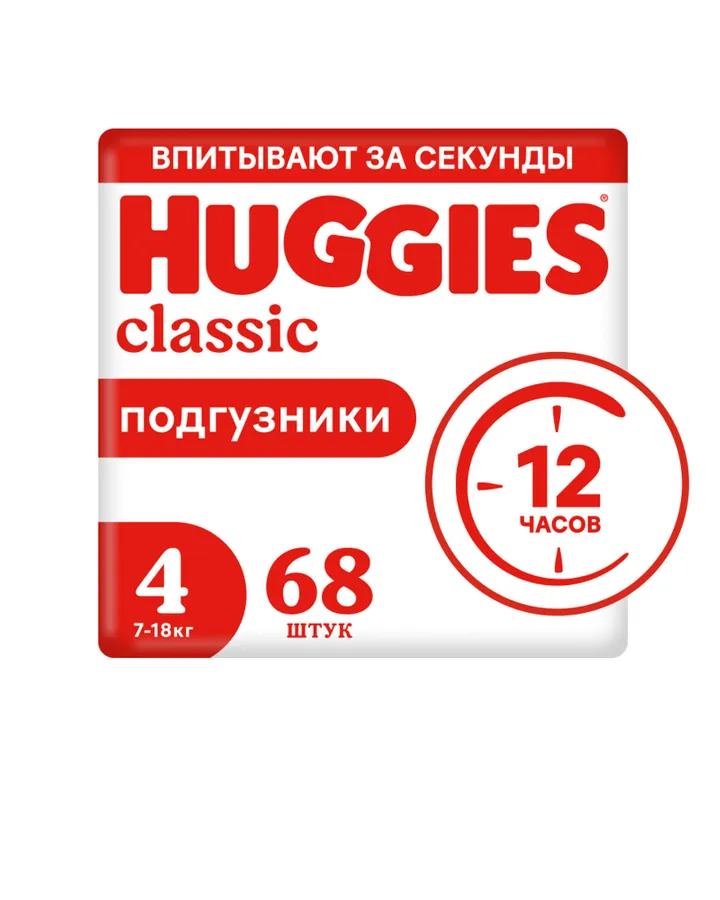 5Подгузники Huggies Classic 4 (7-18 кг) 68 шт.У ребенка алеогия, тригеров очень много, особенно на сорбент и клей в подгузниках. Только не на эти! Совсем не дают реакцию. Это наше спасение! Пробовала менять этой же фирмы но другогоразмера- все не то, эти лучше, жалко что уже малы становятся