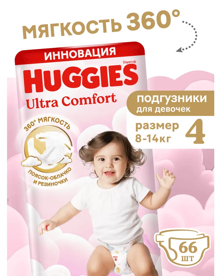 5Подгузники Huggies Ultra Comfort для девочек 4 (8-14 кг) 66 шт.Супер