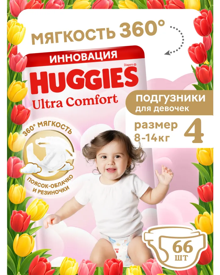 5Подгузники Huggies Ultra Comfort для девочек 4 (8-14 кг) 66 шт.👍💯💯👍💯