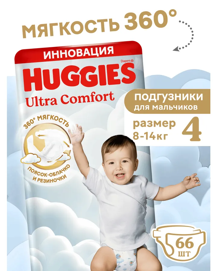5Подгузники Huggies Ultra Comfort для мальчиков 4 (8-14 кг) 66 шт.