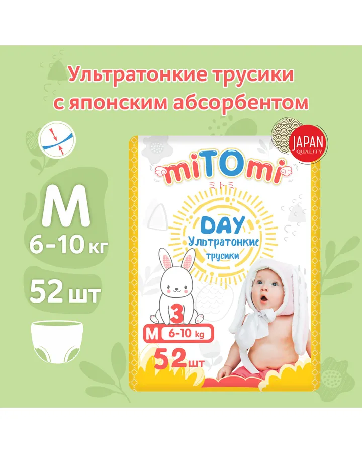 5Трусики miTOmi Day M (6-10 кг) 52 шт.Супер тонкие, не маломерят, не протекают, для нас идеальный вариант. Цена хорошая, особенно по акции. Расцветка красивая