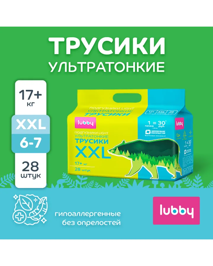Трусики Lubby L 44 шт.Прекрасные трусики, единственные, которые выдерживают ночь, перепробовали много разных, но эти впереди всех. Пишут, что толстые, и? Для ночи это как раз плюс, спим 10-11 часов и не меняемся, выдерживает спокойно. Очень нравится эта фирма, беру и трусики, и поильники, низкий поклон, кто это всё производит, так держать!