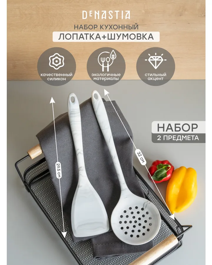 Набор кулинарных принадлежностей DeNASTIA большой 2 шт. (лопатка и шумовка) силикон серый/белый A000360