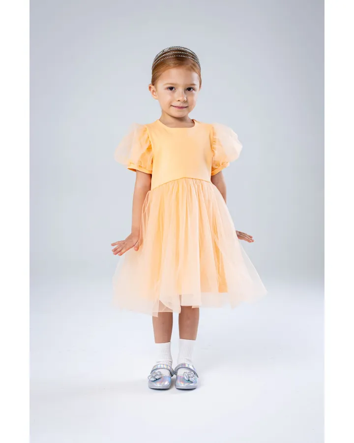 Красивое, нежное платье для девочки. Дочь одень худенькая, платье 104 хорошо село на рост 98. Ниже колен, так что думаю хватит и на этот и на следующий сезон, просто будет немного короче, учитывая что ребёнок худой.
