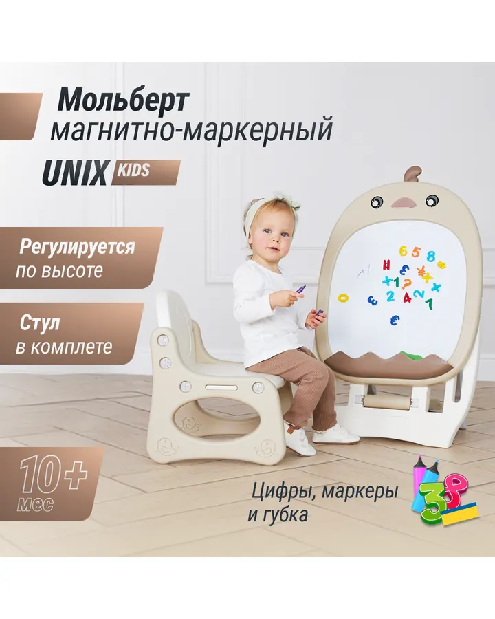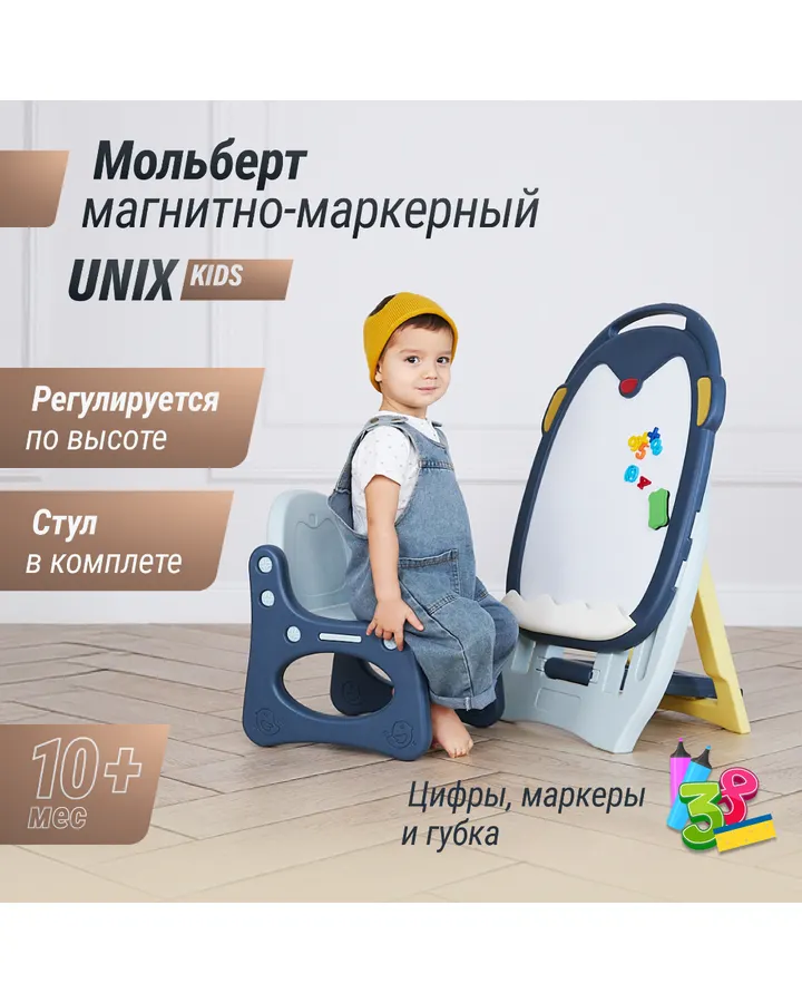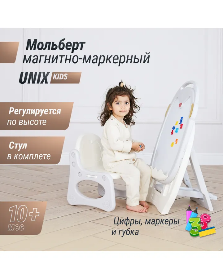 Магнитно-маркерная доска UNIX KidsОтличный магнитный мольберт, можно и рисовать и играть с магнитами, у нас таких собралась целая коллекция со зверушками, а кроме холодильника с ними играть было негде. Теперь сидит с мольбертом, магнитами и маркерами - не оттащиш) Стульчик в комплекте. Внешний вид очень симпатичный, теперь украшение десткой комнаты. Я думаю интерес еще не скоро пройдет)