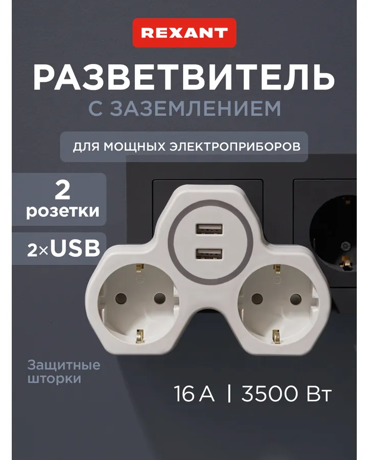 5Двойник электрический REXANT с заземлением и защитными шторками + 2 USB порта белыйВсе работает отлично!