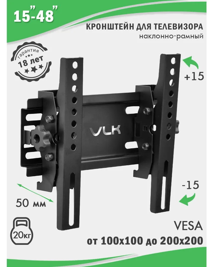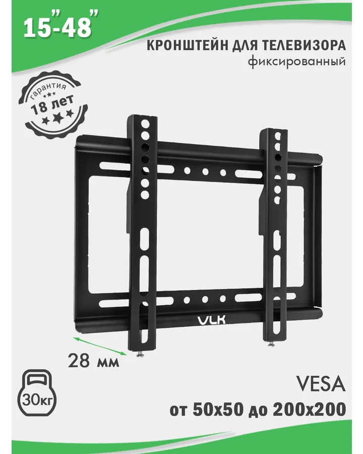 5Кронштейн для телевизоров VLK TRENTO-34Советую, качественный продукт на долгие десятилетия, оправдал все ожидания. Монтаж провел в одиночку и с успехом. Спасибо производителю, что наполнил комплектацию всеми крепежами и болтами, иначе бы пришлось потратить больше времени, если бы понадобилось что-то ещё докупать самостоятельно, рад, что обошлось без лишней суеты, купил и сразу всё повесил, делов минут на десять-пятнадцать. Телевизор идеально сошёлся с кронштейном, висит уверенно и не вызывает за свою сохранность никаких опасений. Думаю, он так провесит, пока сам не решусь снять, а я такого не планирую, ибо давно хотел повесить телевизор на стену, там ему самое место и удобно. К покупке товар рекомендую, в качестве убеждён, берите смело.