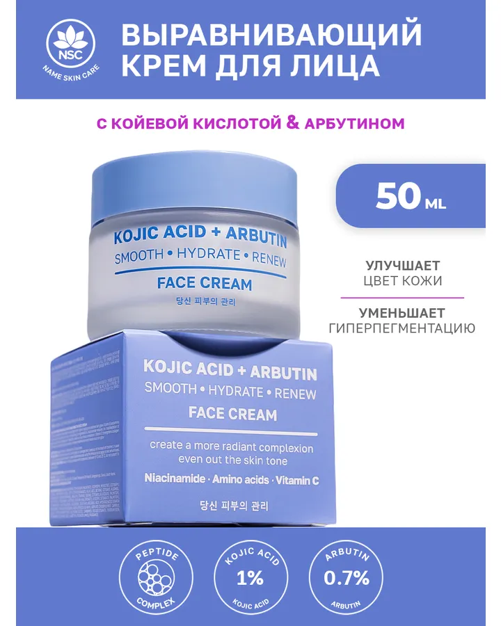 5Крем NAME SKIN CARE с койевой кислотой и арбутином 50.1 млКрем понравился, хорошо впитывается, рекомендую к покупке.