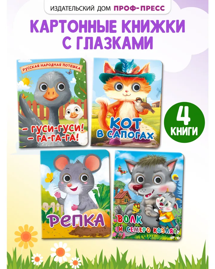 Книжки картонные Проф-Пресс с глазками. Сказки. 4 шт. Гуси гуси+Кот в сапогах+Репка+Волк и семеро козлят