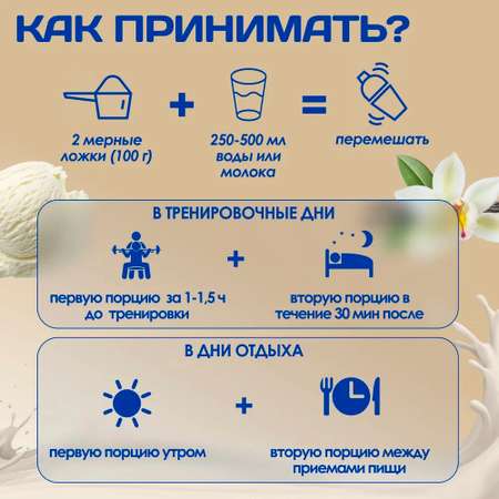 Принимать гейнер можно перед тренировкой для придания энергии, чтобы повысить интенсивность и длительность занятия, или после тренировки для восполнения потраченной энергии. Суточную дозу можно разделить на несколько частей, принимая в течение дня. Общее количество средства зависит от массы тела и количества приемов пищи в день.