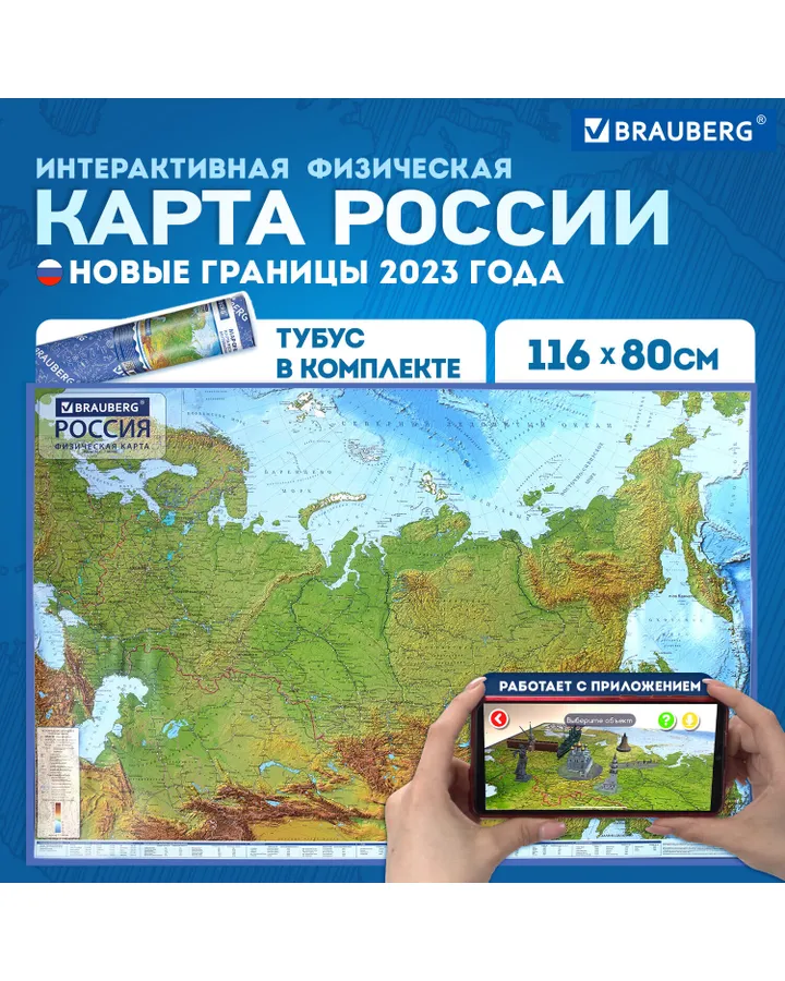 5Карта России физическая Brauberg на стену интерактивная 116х80 см 1:7.5М