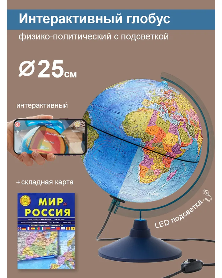 5Глобус Globen Интерактивный рельефный и утяжелителем 32 см + карта + лупа + VR очкиКласс!