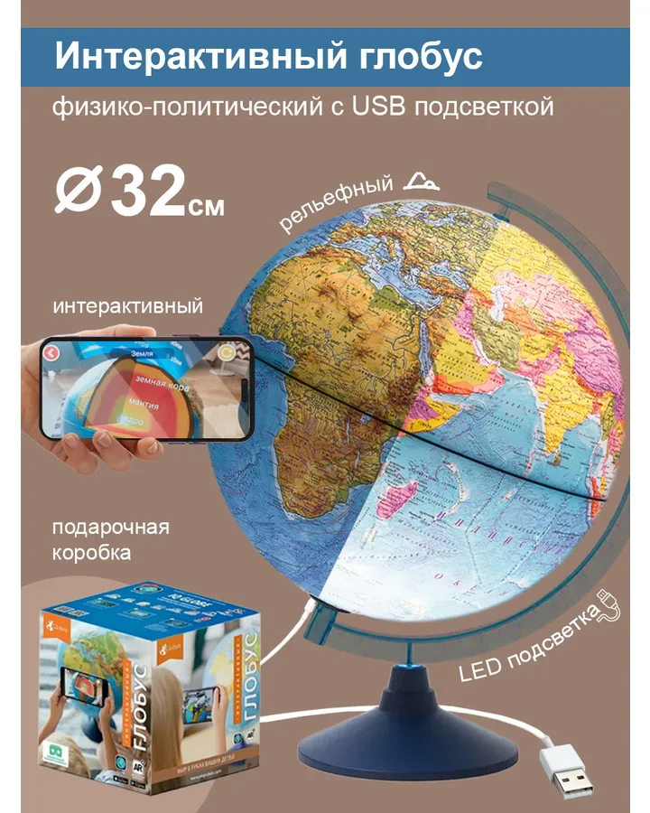 Глобус Globen Земли интерактивный политический 32см с LED-подсветкой атлас VR очки