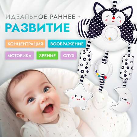 Игрушка Lamaze подвескаПо акции все прекрасно) есть зеркало, пищалка, бубунчик, шуршалка, прогрызыватель, колечки и разные фактуры; велюр, вафельная, меховая ,кудрявая ,атласная . Размер хороший не большой не маленький. Брала за 400р) прекрасная цена спасибо дм!