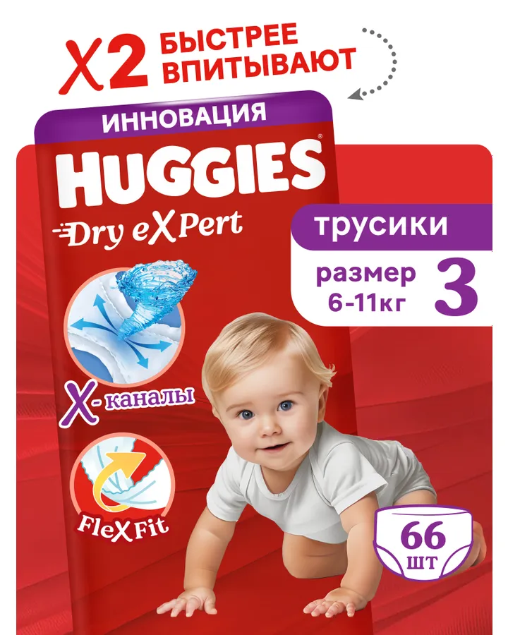 Встречайте новинку! Инновационные подгузники-трусики Huggies Dry eXpert с Х-каналами – настоящие эксперты в сухости и комфорте для детей 6-11 кг. Уникальные Х-каналы, словно воронка, впитывают жидкость Х2 быстрее и равномерно распределяют ее. Технология Хагис FlexFit: трусики остаются удобными и пластичными даже в наполненном виде, и никакого комка между ножек. Технологичный суперабсорбент надежно удерживает влагу внутри надолго. Кожа малыша остается сухой до 12 часов. Эластичные барьерчики обеспечивают двойную защиту от протеканий. Мягкие материалы обеспечат маленьким экспертам дополнительный комфорт. Инновационный товар для малышей подгузники трусики Хаггис 3 размера M не содержат отдушек, хлора и латекса. Яркий и веселый дизайн подойдет и мальчикам, и девочкам.