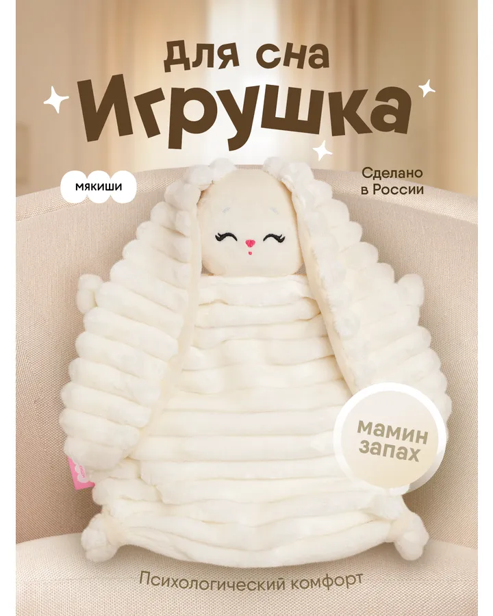 Мягкая игрушка Мякиши для новорожденных Зайка БанниОчень мягкая, нежная игрушка. Клала во время кормления между мной и ребёнком. Благодаря ей ребёнок дольше и спокойнее спит