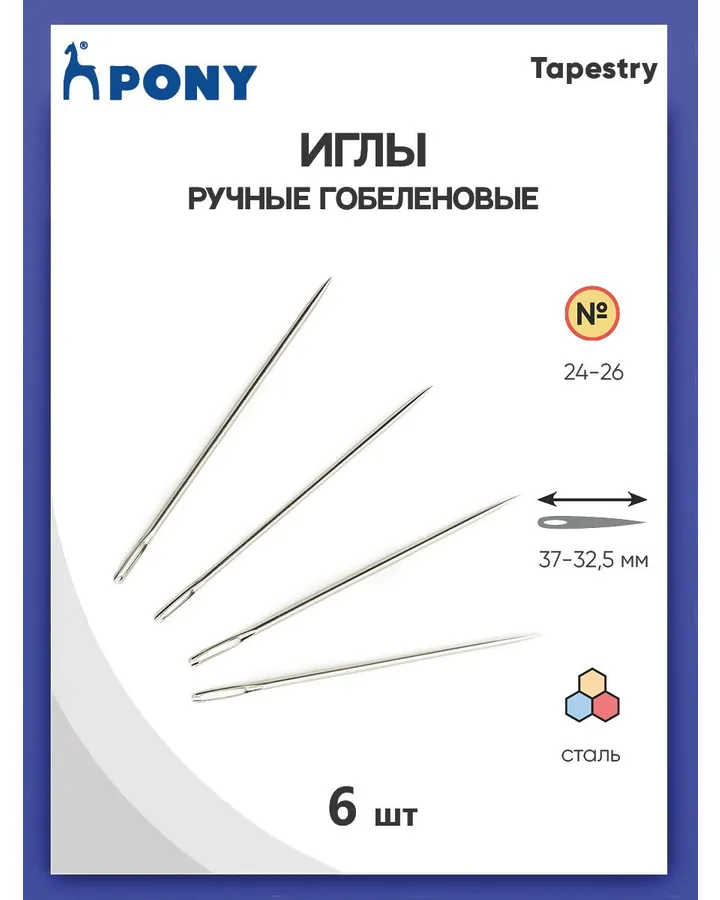 Иглы Pony ручные стальные с вытянутым ушком тупым концом для трикотажа Tapestry № 24-26 6 шт 05310