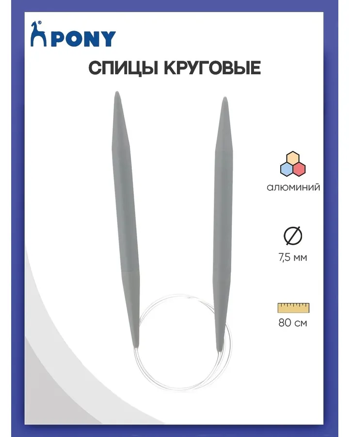 Спицы круговые Pony алюминиевые гладкие с покрытием с гибким тросиком 7.5 мм 80 см 50216