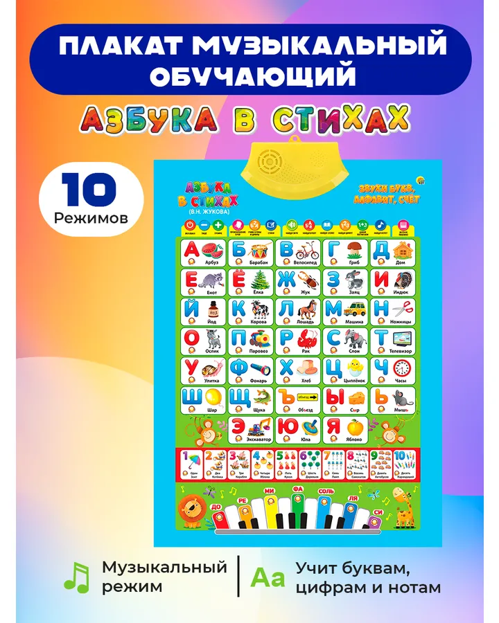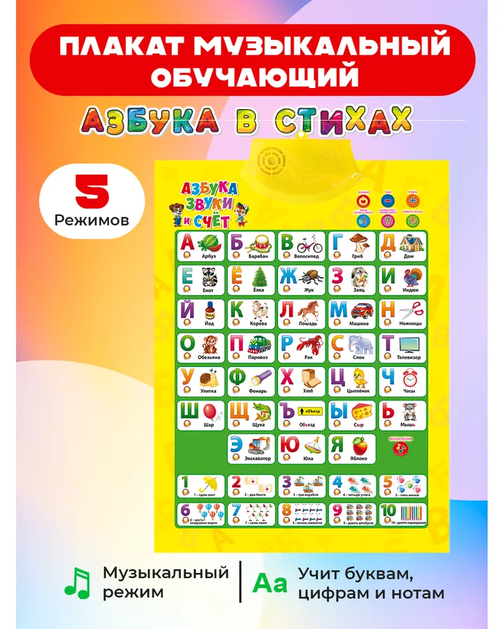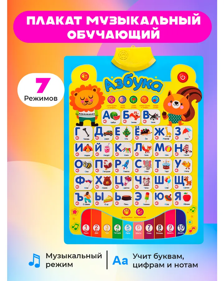 Игрушка Рыжий кот АзбукаОтличный говорящий плакат . Очень давно искала что то такое. Тут есть все буквы ,цифры ,песни, ноты , цвета слова . 7 программ . Ребенок 2 года очень увлечен уже 3 месяца , не надоедает. В день один два раза берет стульчик садится как профессор и всех втягивает в процесс. Спасибо .