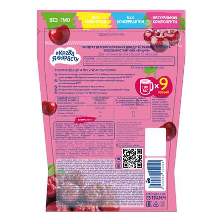 Кисель ФрутоНяня из вишни и черешни для питания детей раннего возраста 130гВкусный, особенно со вкусом клубники -малины, ребенок обожает эти кисели.