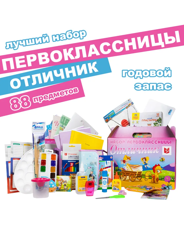 Набор школьника Отличник 57 предм.Отличный набор для подготовки к школе. Отдельно ничего не пришлось докупать, нашли в нем всё, что перечислил учитель. Приятный бонус - сама папка, которая также используется для переноски и хранения школьных принадлежностей.