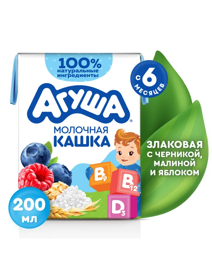 Каша молочная Агуша злаки черника-малина-яблоко 2.7% 200мл с 6месяцев