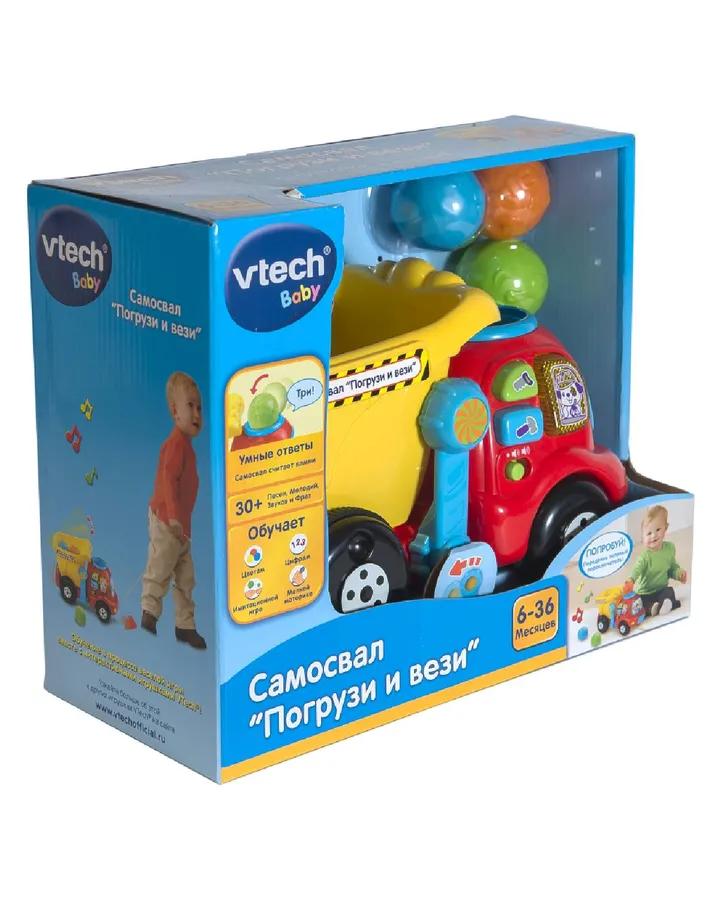 Покупала внуку на день рождения, на 2 года, самосвал функциональный, много музыки, шарики проталкиваются через кабину в кузов, развивает моторику, внук любит возить его за верёвочку. Кузов поднимается и шарики можно выгрузить. Учит цвета, учит считать шарики.