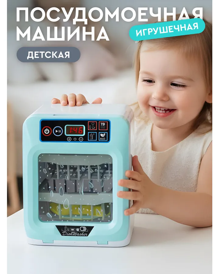Выполнена качественно в каждой мелочи. Смотрится как нвстоящая, да еще и с набором посуды, которая устанавливается в выдвигающуюся корзину, заливается в отсек средство для мытья, машинв закрывается и моет с водой. Ребенок была в восторге, я тоже. Очень хорошая игрушка!