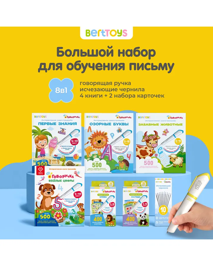 Большой комплект BertToys Собачка БуляСказать, что я в восторге - это ничего не сказать! Это очень замечательная вещь!!! Первую такую книгу нам подарили на 4года, та которая просто разговаривает и писать можно! Вот этот набор мы уже купили сами! Когда я принесла домой и включила эту ручку, я на полчаса залипла от репертуара этой ручки, это вообще супер волшебная вещь!!! Поэтому не жалейте денег, это реально очень интересно и познавательно, ребенок очень увлечен этими книгами и естественно будем в дальнейшем брать еще серии книг!!! Спасибо, тому кто придумал такую замечательную вещь!!!!