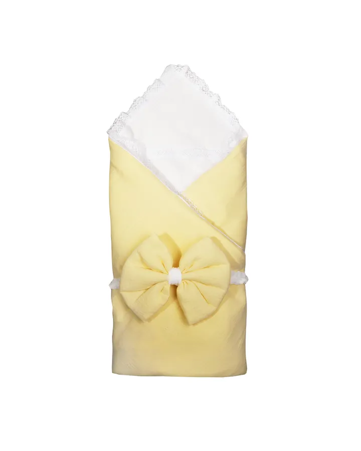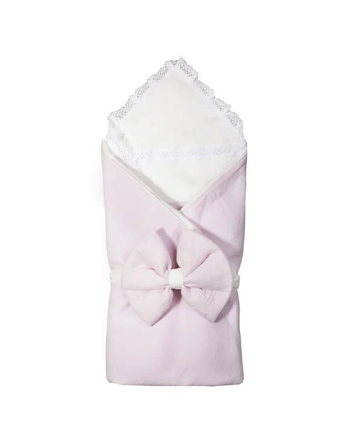 Красивый, нежный цвет, мягкий муслин. Красивая кружевная пеленка. Тонкое одеялко будет удобно для дальнейшего использования.