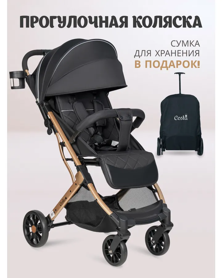 5Коляска прогулочная Costa всесезонная черныйВыбирали коляску в розничном магазине, взяли в детском мире. Управляется одной рукой, сложить и разложить можно за минуту, с ребенком в руках конечно не соберешь не разберешь. Сама коляска по весу не легкая, но и не тяжелая, но самостоятельно загрузить в машину получится. Глубокий капор хорошо защищает от снега. По снегу идет хорошо, купили ее на весну и лето, и сейчас зимой возить в деревню, тк 3в1 люлька в машину не помещается. Удобно брать с собой. Корзина вместительная, есть доступ со всех сторон. Стильный дизайн коляски.