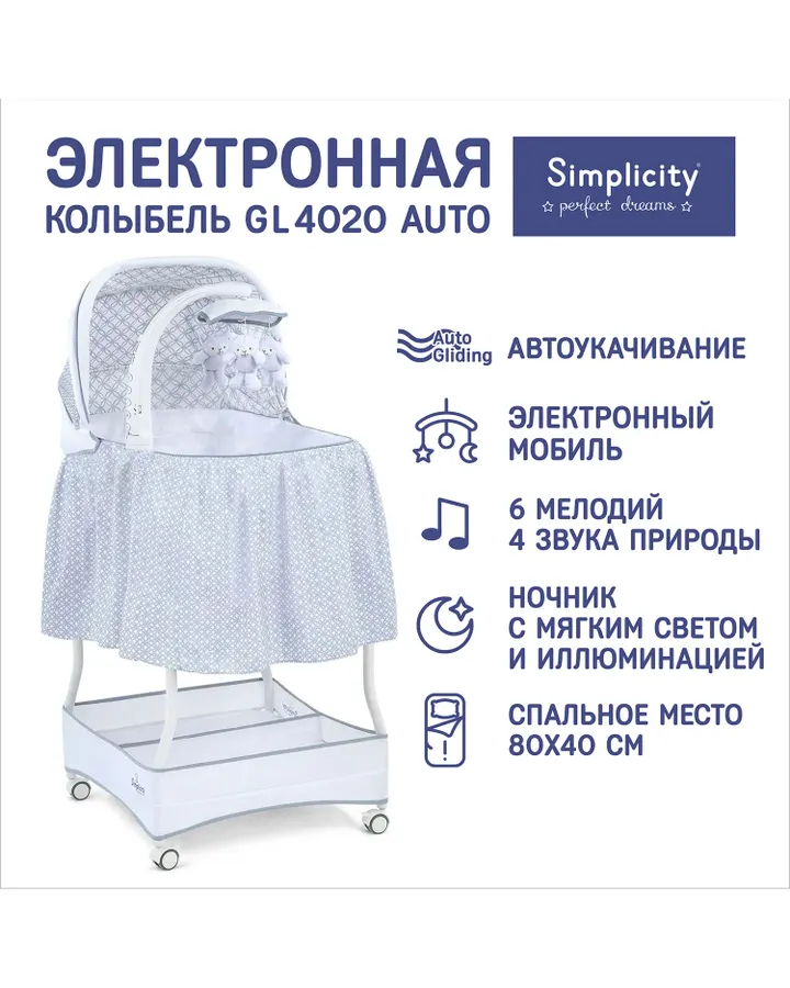 Колыбель SIMPLICITY AutoОтличная колыбель, жаль нет размера побольше)Пришла хорошо упакована , полный комплект. Очень долго выбирала и изучила много моделей, в этой колыбели собрано все что мне нужно: автоукачивание мягкое и бесшумное, мягкие колесики, капор с игрушками, музыка , подсветка, очень приятные материалы, корзина для игрушек, пеленок и т.д. Передвигаем по всему дому, хватит думаю месяцев до 5-6 .