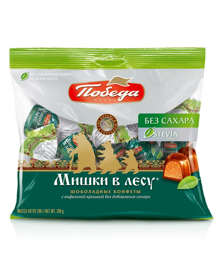 Конфеты Победа вкуса шоколадные без сахара Мишки в лесу с вафельной крошкой, 200г