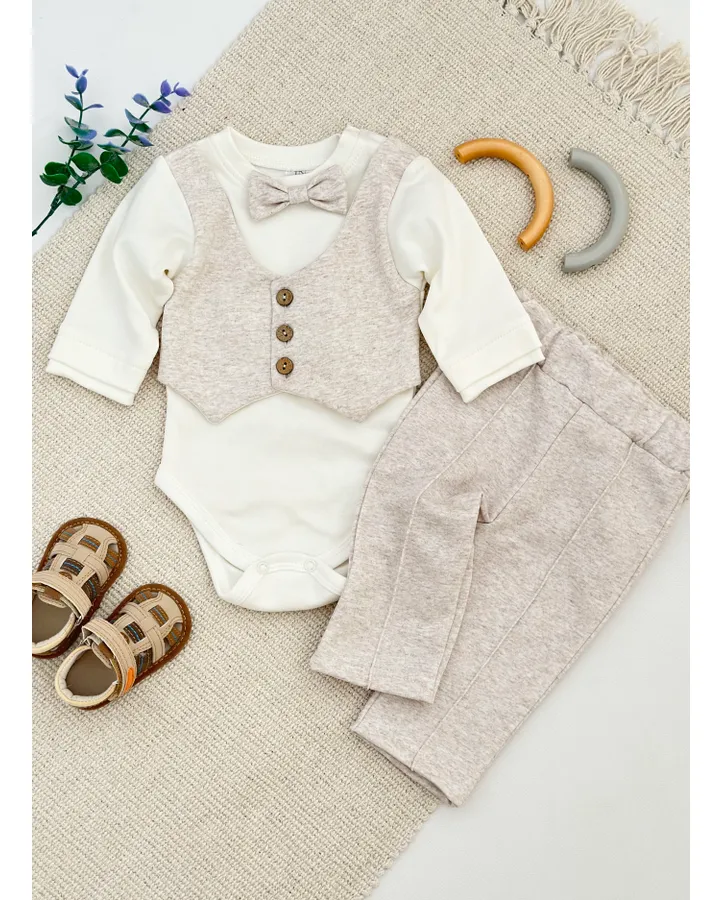 Отличный набор, качество прекрасное, мягкое, приятное к телу, шапочка сидит красиво, свободно, хорошо обхватывает головку и не колется, штанишки хорошо сидят, тянутся в меру, ремешочек с резинкой хорошо продуман и не стягивает животик. Взяла на размер больше, но за счёт подвернутых манжетов смотрится аккуратно и " специально на вырост" не выглядит.