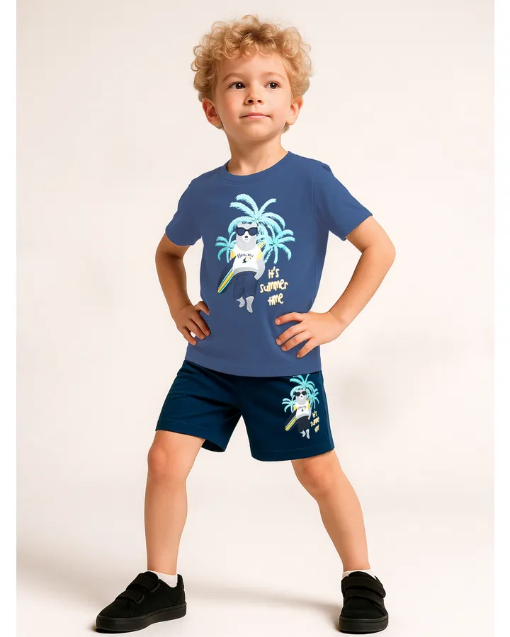 Отличный домашний костюм . Для мальчика найти тонкие штаны проблема. Любят играть на полу, коленки закрыты, тонкие- не жаркие. С футболкой с коротким рукавом то что надо, для дома) Не линяет, не сел.