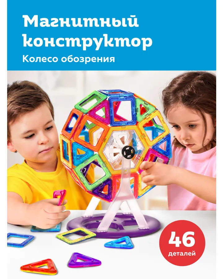 Конструктор ON TIME Колесо обозрения магнитный 46 дет.Внук собрал довольно быстро, получилось симпатичное и довольно крепкое колесо обозрения.