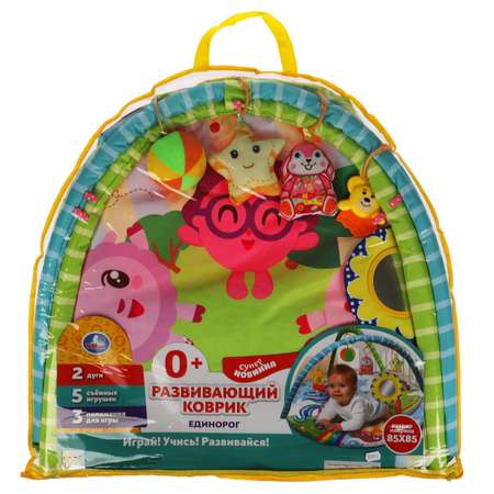 Отличный игровой коврик для маленьких детей. В наборе 5 мягких съемных игрушек-пищалок с изображением домашних животных, 2 дуги, 3 положения для игры. Весь это набор упакован в удобную сумку. Ребенку очень нравится играть на этом коврике.