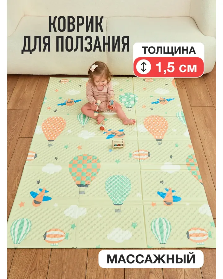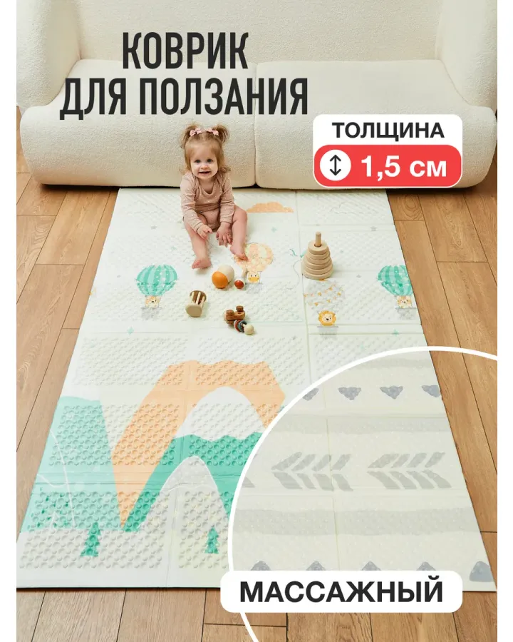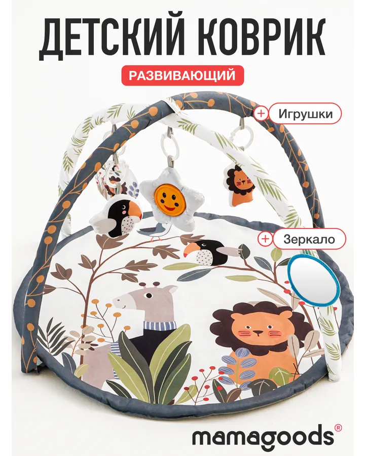 Коврик Mamagoods с дугами ЛевКак папа, я оценил в этом коврике три вещи: безопасность, функциональность и интерес сына. Конструкция дуг очень устойчивая, игрушки крепко держатся. Сын с самого начала стал тянуться к подвесным игрушкам, а сейчас уже пытается их схватить – отличная тренировка координации. Зеркало – это must-have! Рисунок на самом коврике тоже интересный. Сын очень любит львов. Отличный тренажерный зал для малыша!»