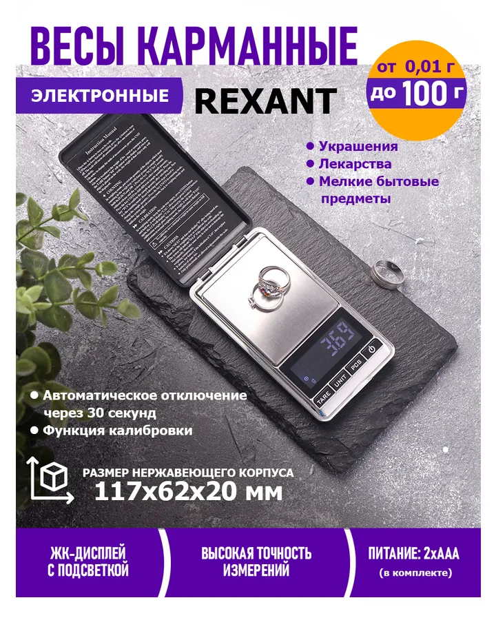 Карманные весы REXANT электронные с подсветкой для взвешивания мелких предметов до 100 гр