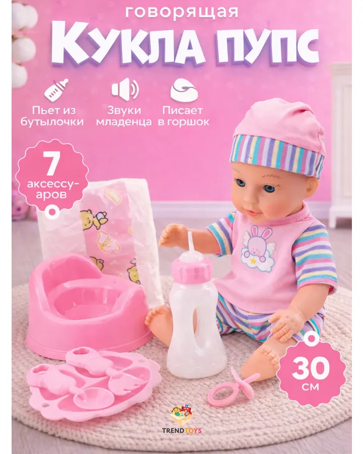 Кукла пупс TrendToys говорящая с аксессуарами высота 24 смКукла классная, качественная, миленькая, издает звуки, красивая одежда, рекомендую