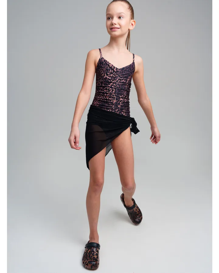 Красивый очень, но маломерит. Взяла на упитанную девочку ростом 132 размер 146. Низ растягивается с трудом, верх тоже в подмышках поджимает.