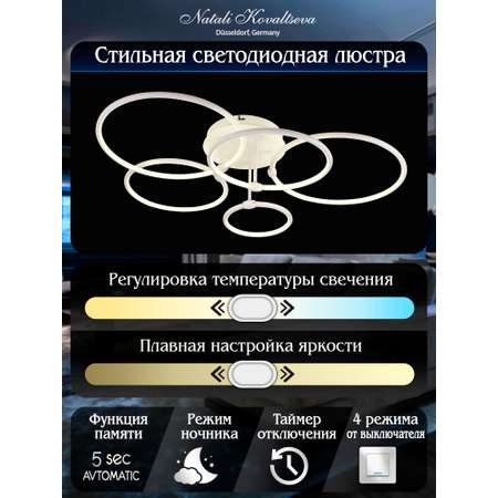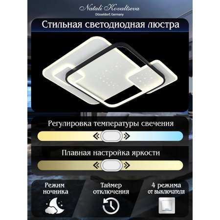 Люстра NATALI KOVALTSEVAСупер люстра! Довольна вся семья, удобно в пользовании, очень яркая. Разные режимы освещения, что удобно для разного времени суток и настроения. Хорошо освещает большое помещение. Размер у люстры не маленький. Не для маленького помещения. Можно для низкого потолка. Суперская люстра!