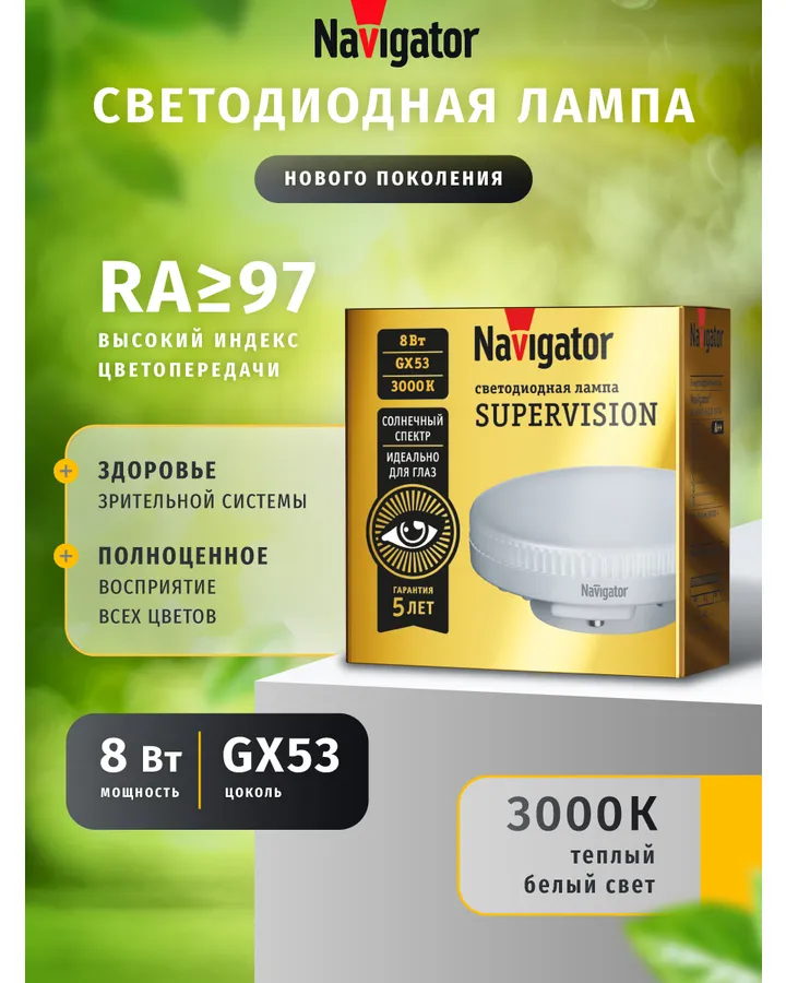 Лампа светодиодная солнечного спектра Navigator 95 432 GX53, 8 Вт, 3000К