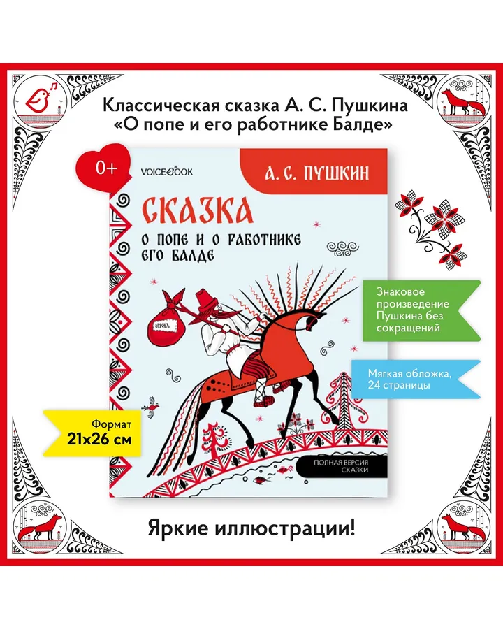 Сказка о попе и о работнике его Балде VoiceBook Пушкин А. С.Потрясающей красоты книга! Очень красивые иллюстрации, 5 летний сын, увлекающийся народной росписью, оценил. На полях разъяснения устаревших слов, очень удобно!