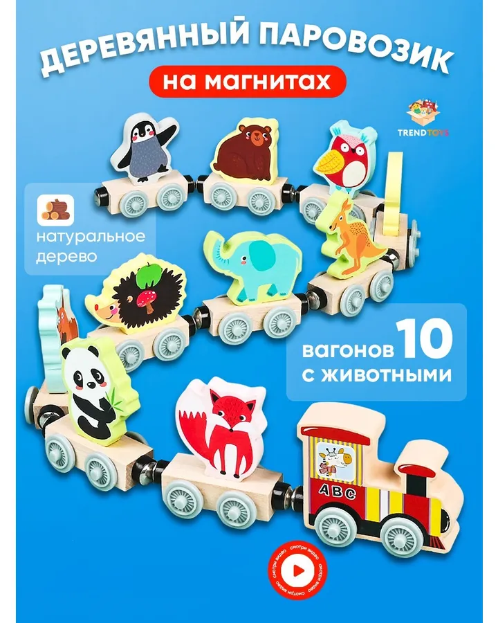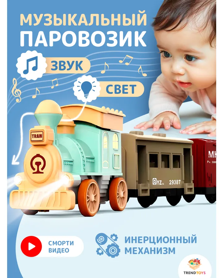 Детский музыкальный паровозик с вагонами TrendToys интерактивныйЗамечательный подарок для каждого ребенка, подойдет как самым маленьким, так и деткам постарше. Выполнен качественно, прочный. Фары светятся довольно ярко, звук четкий, мелодия приятная. Вагоны крепко фиксируются между собой, играть очень удобно