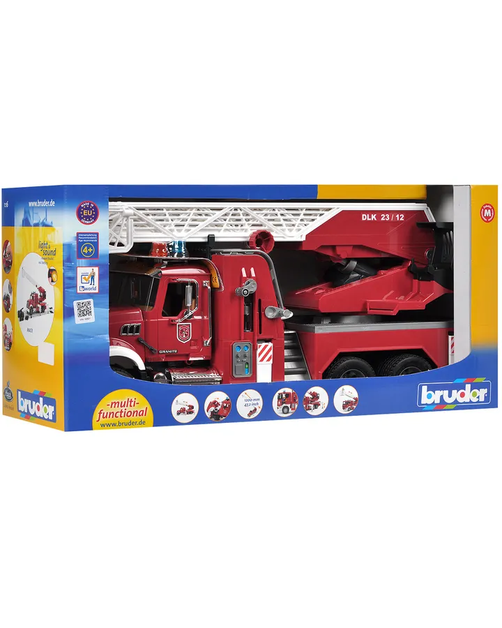 5Пожарная машина Bruder MAN (свет и звук) с аксессуарами 1:16Машину на новый год нам принес дед мороз и это уже 1.5 мес ежедневной игры, ребенку 2.9 он от неё в восторге, сирена 4х видов, детали продуманы до мелочей,очень реалистично выглядит, так же может брызгаеться водой, у нее высокая лестница, есть поворотные механизмы,однозначно рекомендую. Была докуплена фигурка пожарного,которого удалось усадить в машину за руль через окно.