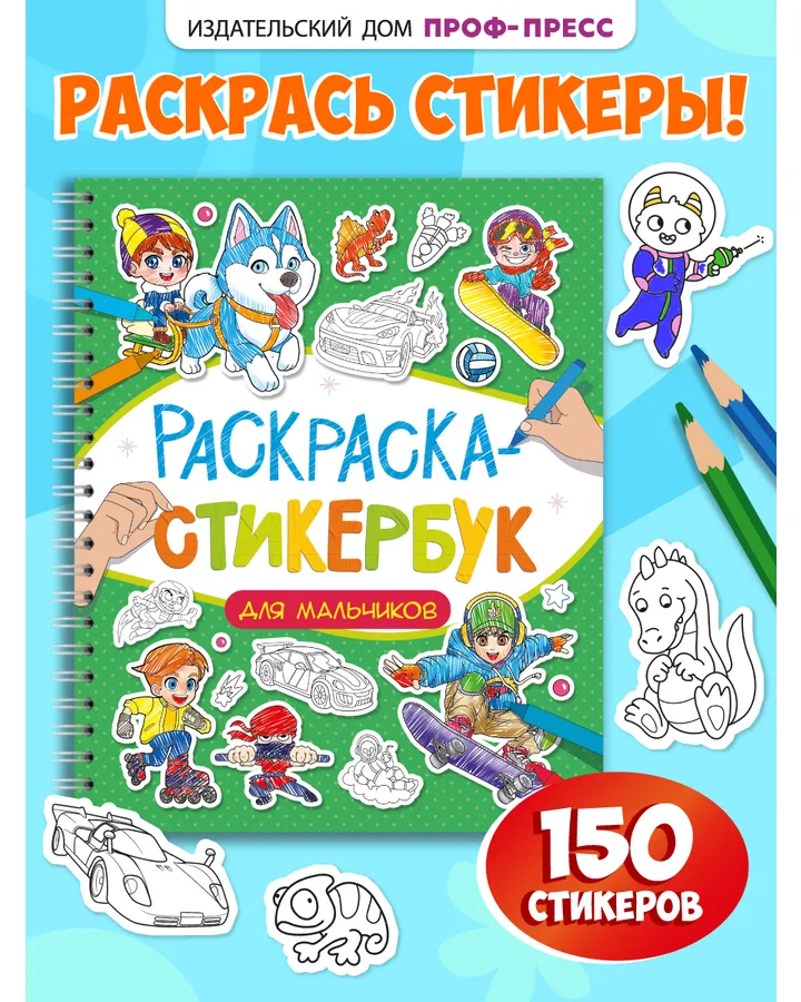 Раскраска-стикербук Проф-Пресс Раскрась стикер сам. 150 наклеек. Для мальчиков. А5. на гребне