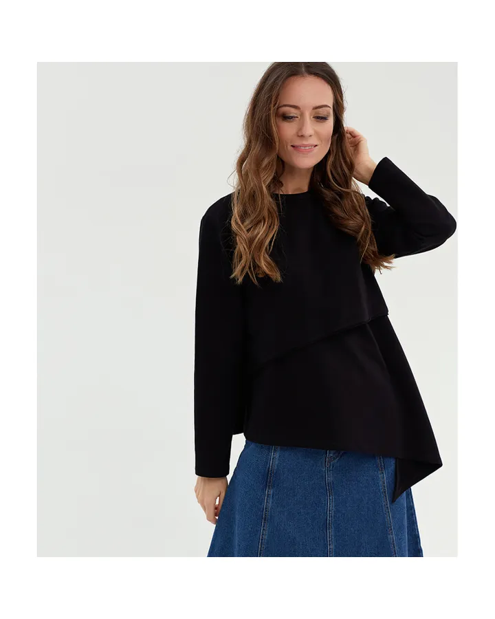- Длина. Растущий живот и грудь кардинально изменят тело, поэтому привычная длина водолазок и свитшотов уже не подойдет. Для защиты поясницы рекомендуется верх длиной до середины бедер, не короче.